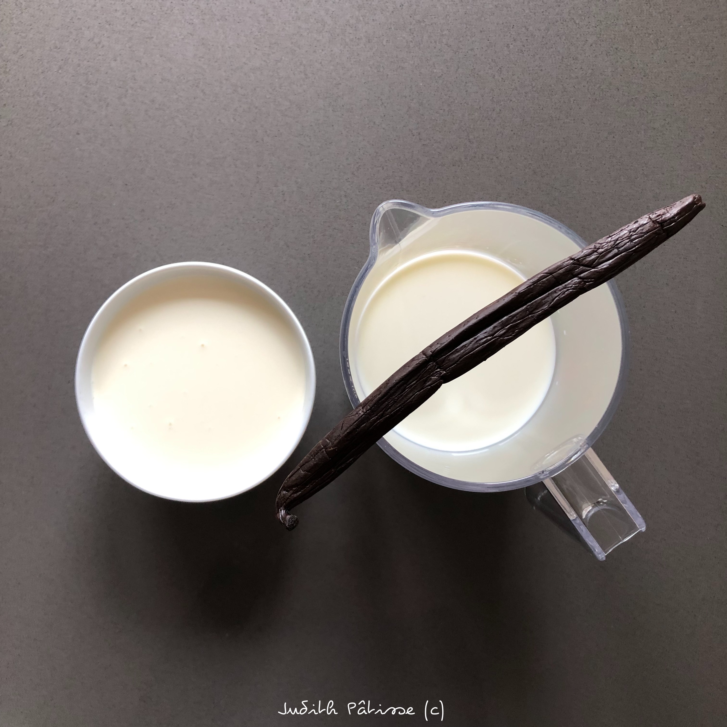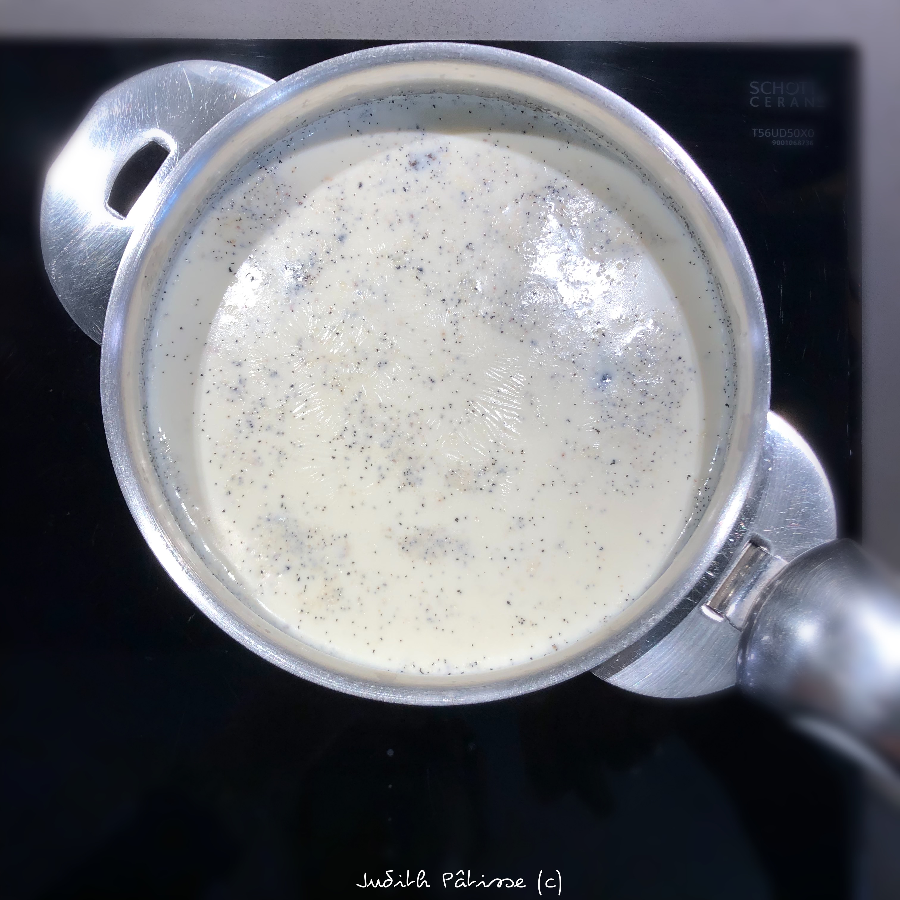 Coupez votre gousse de vanille en 2 et grattez-la pour en extraire les graines. Mettez l’ensemble (graines + gousse) dans la casserole de lait-crème. Faites bouillir – pas trop rapidement, puis éteignez le feu et faites complètement refroidir, en laissant toujours la gousse dedans.