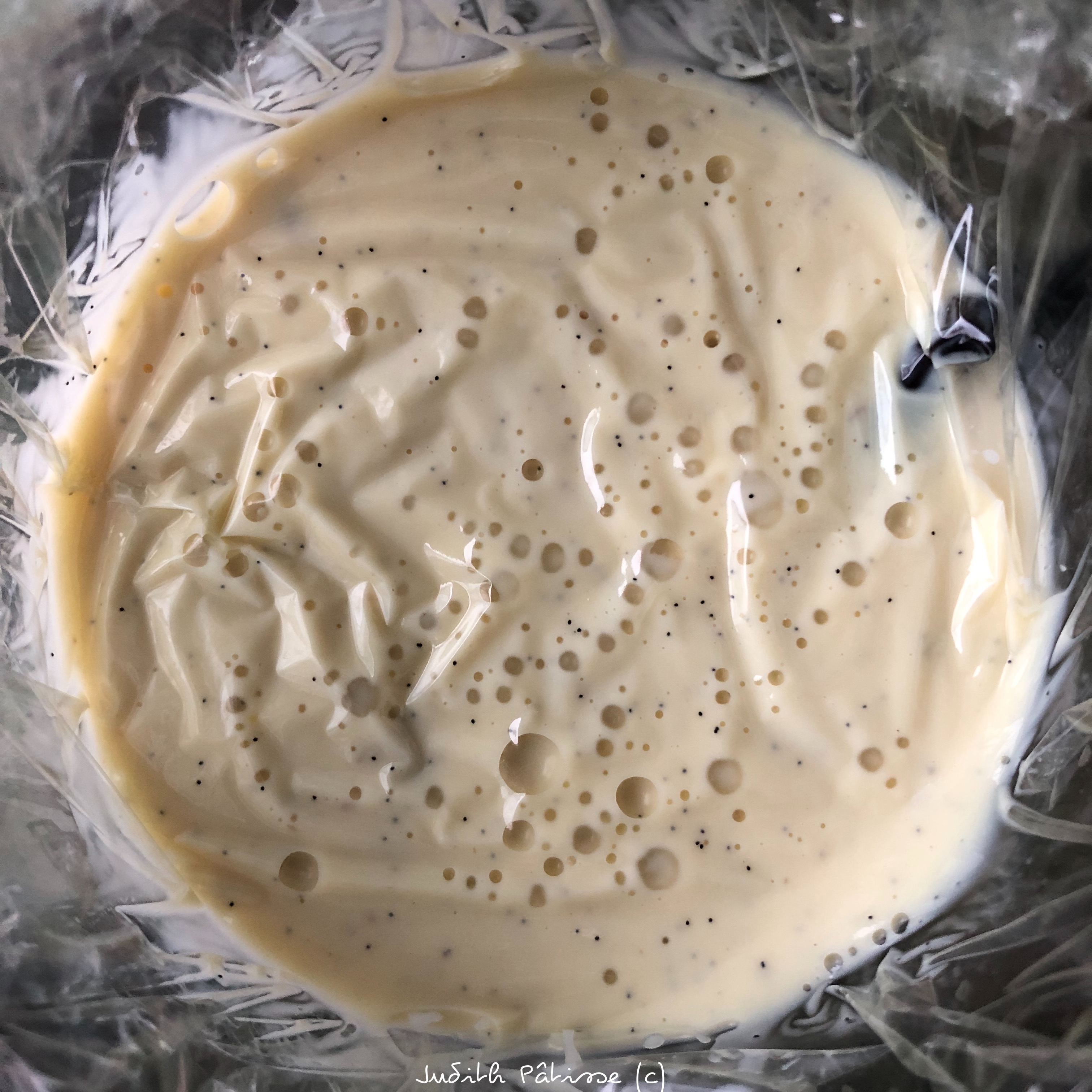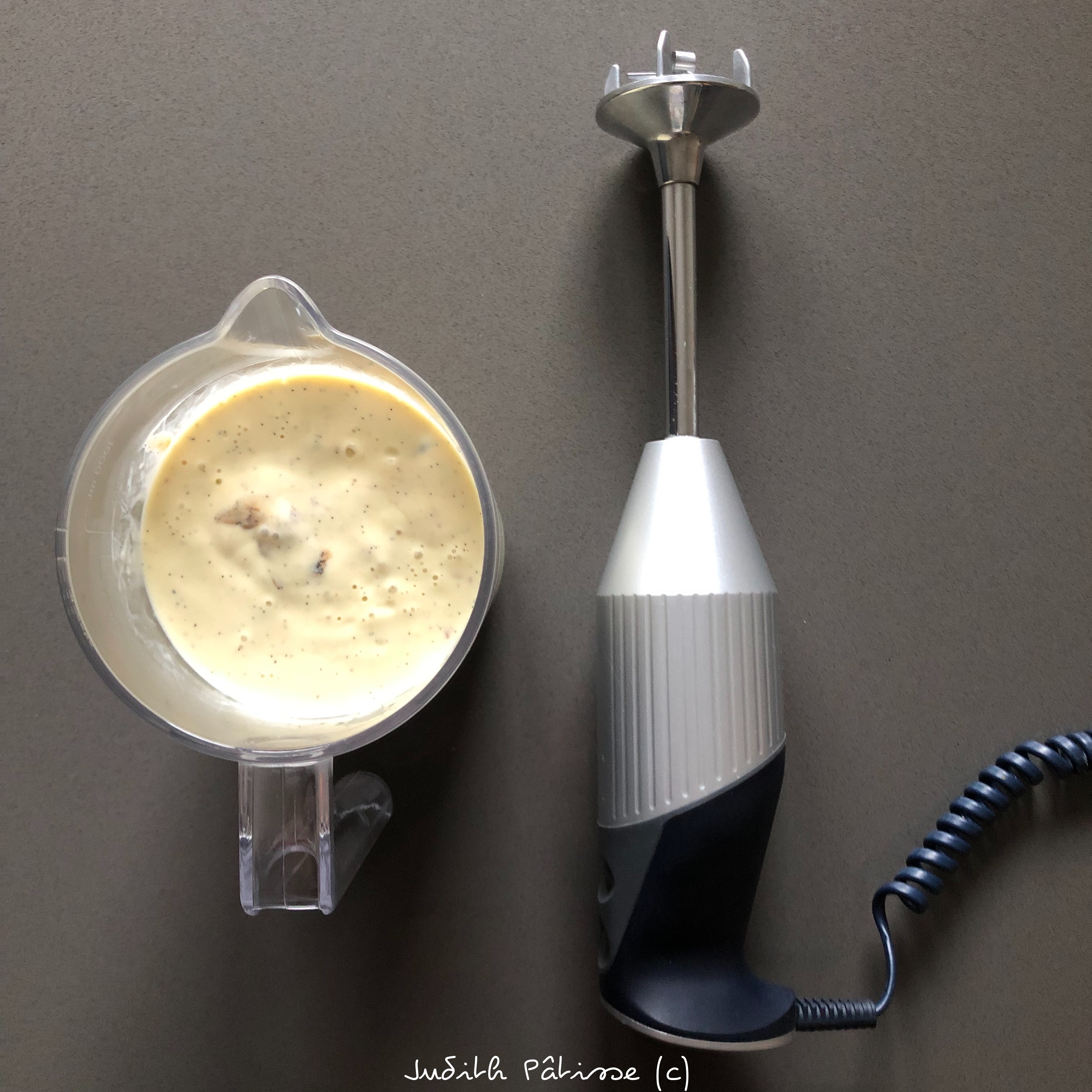 Le lendemain matin, ou quand votre mix a atteint la température de 4°C, sortez la gousse et pressez-la pour récupérer un maximum de mix. On ne perd rien ! Mixez une minute avec votre mixeur plongeant (recyclez votre gousse de vanille en la passant sous l’eau, puis laissez-la sécher, et mettez-la dans votre pot de sucre en poudre pour faire du sucre vanillé ;-))