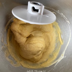 Le pétrissage sera terminé quand la pâte se décollera de la cuve, comptez environ 5 minute au total. La pâte doit être bien brillante :