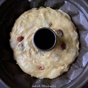 Au bout des 5 minutes, faites un trou au milieu de la boule avec un doigt, saisissez-la et déposez-la dans le moule à Kouglof. Appuyez pour que la pâte se mette bien au fond. Essayez d’avoir un ensemble plat et régulier :