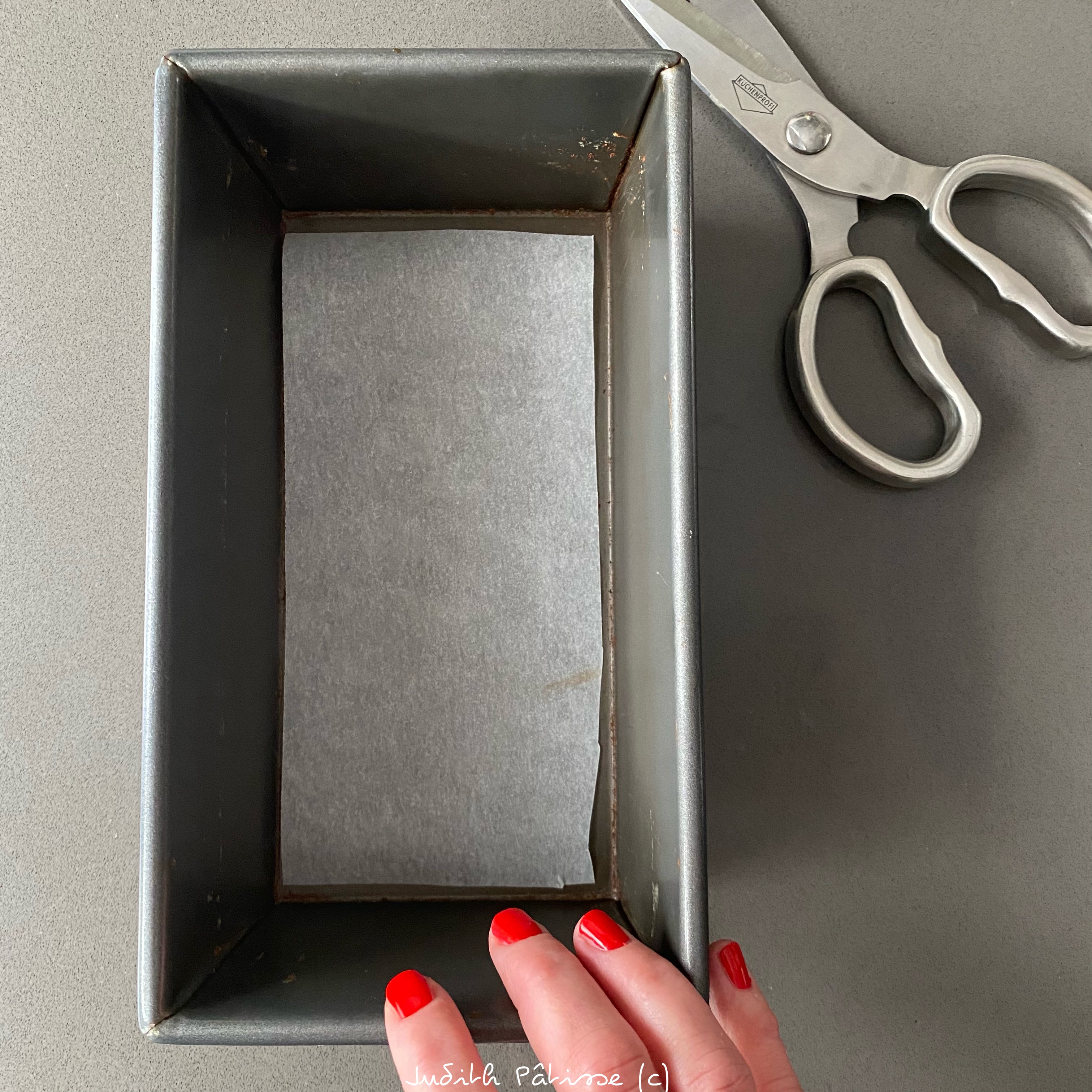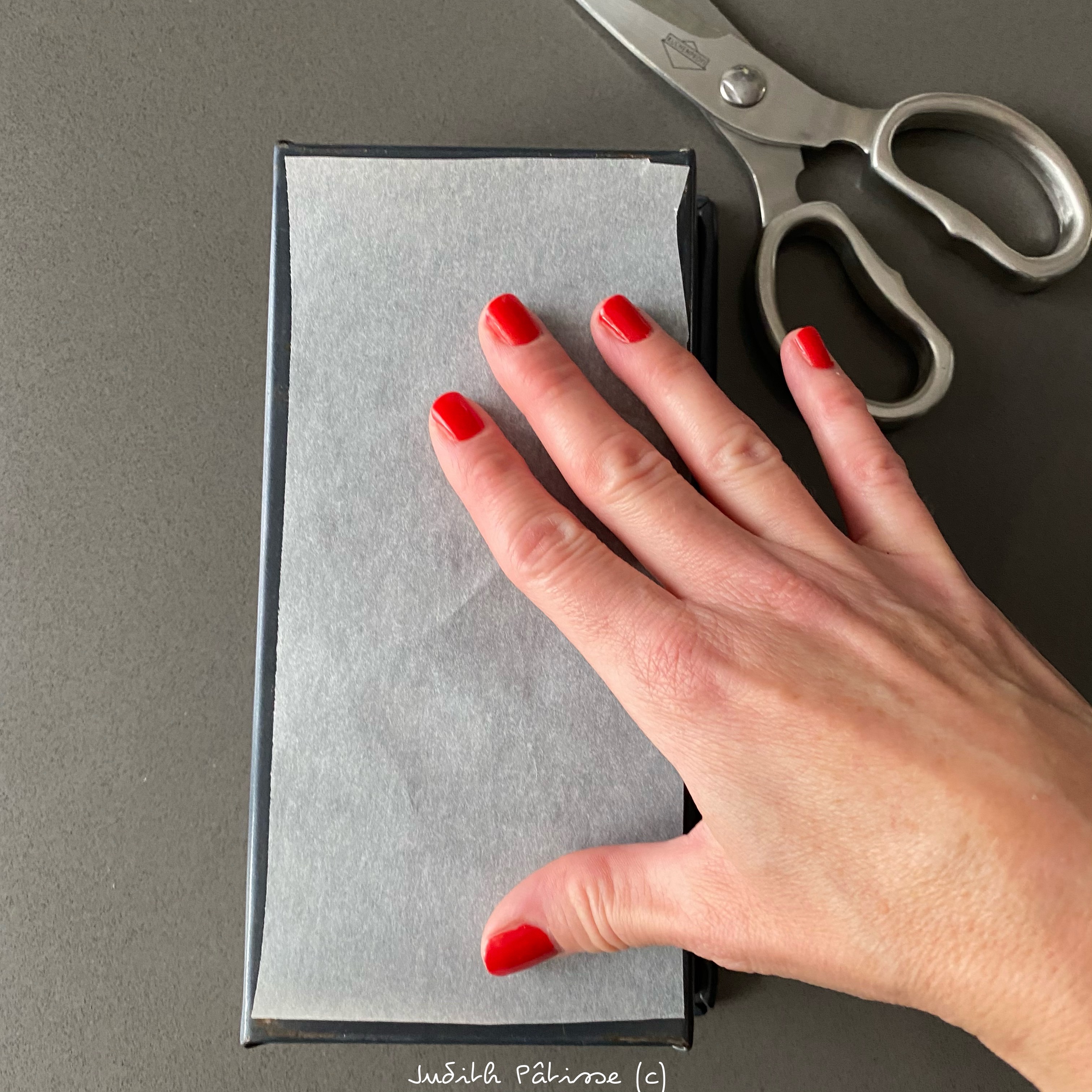 Maintenant, un peu de travaux pratiques : tournez votre moule à cake à l’envers, et découpez un morceau de papier sulfurisé de la taille du fond du moule. Remettez votre moule à l’endroit et déposez-y au fond le morceau de papier tout juste découpé :