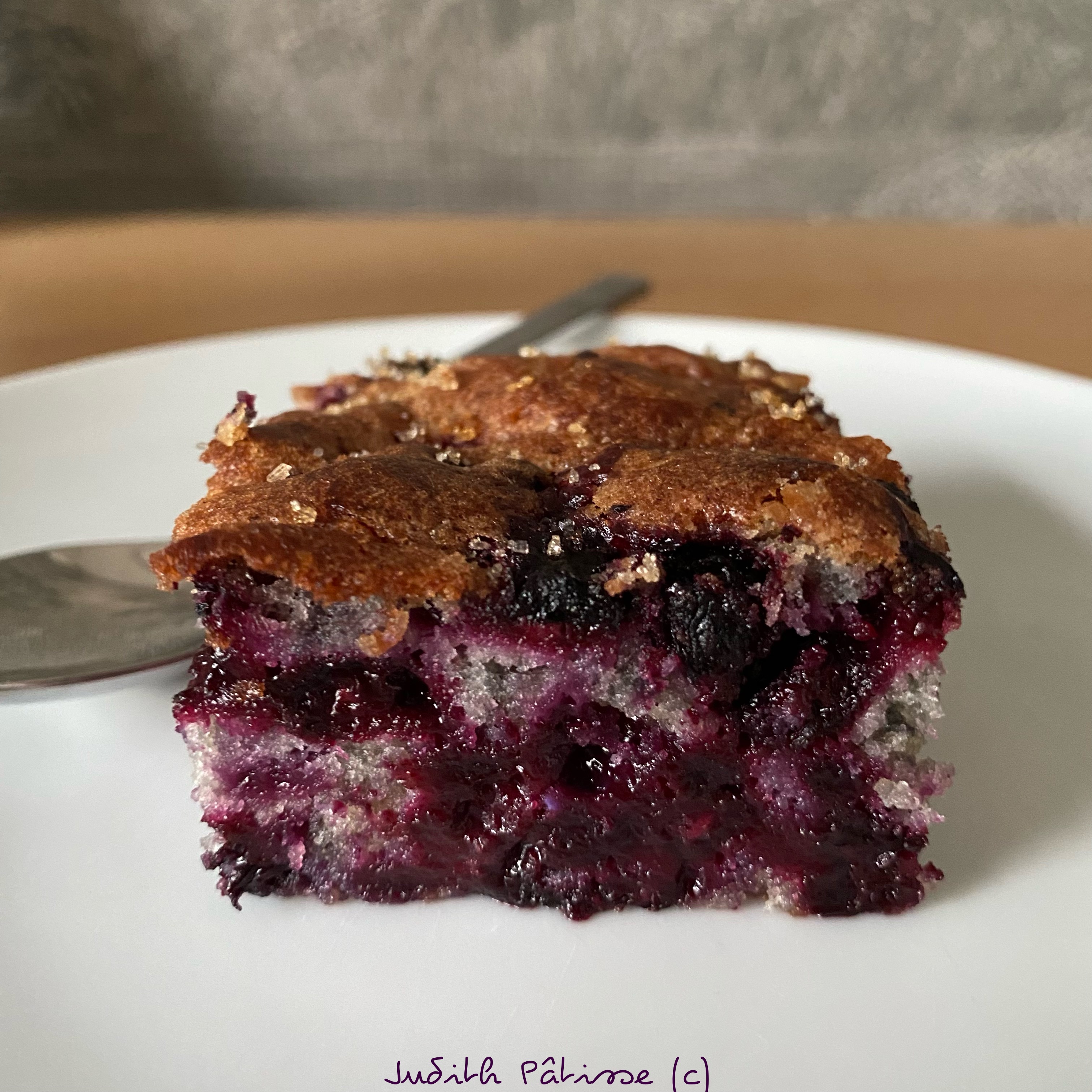 La recette originale est proposée avec du cassis, mais Linda précise que ce moelleux peut également être réalisé avec des myrtilles… Et on adoOore les myrtilles à la maison… Vous me voyez venir… Ni une ni deux, j’ai couru acheter des fruits surgelés – ça marche aussi bien avec des fruits frais que surgelés, on ne peut pas faire plus pratique, et j’ai réalisé cette merveille. D’une, la recette est uuuuultra simple, de deux, il y a très peu d’ingrédients et de trois… ben c’est une dinguerie ! J’ai juste très légèrement modifié les quantités de beurre et de sucre (-10g de chaque) pour que ce soit parfaitement à notre goût, Mais c’est véritablement un gâteau qui devrait faire partie de tout bon carnet de recettes familiales.