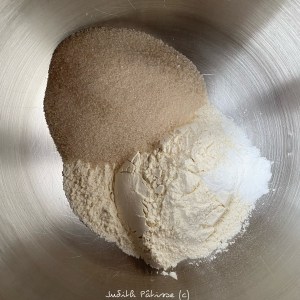 Dans le bol de votre choix, ajoutez les poudres, à savoir les 170g de sucre en poudre, les 150g de farine, et les 4 g de levure chimique :