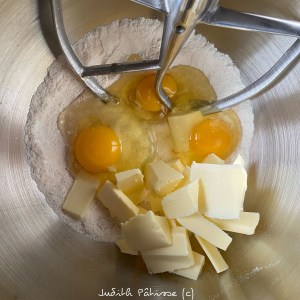 Ajoutez ensuite les 140g de beurre pommade et les 3 oeufs entiers :