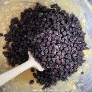 Si vous utilisez un robot, décrochez le bol et munissez-vous d’une spatule. Ajoutez alors les myrtilles (encore surgelés) :