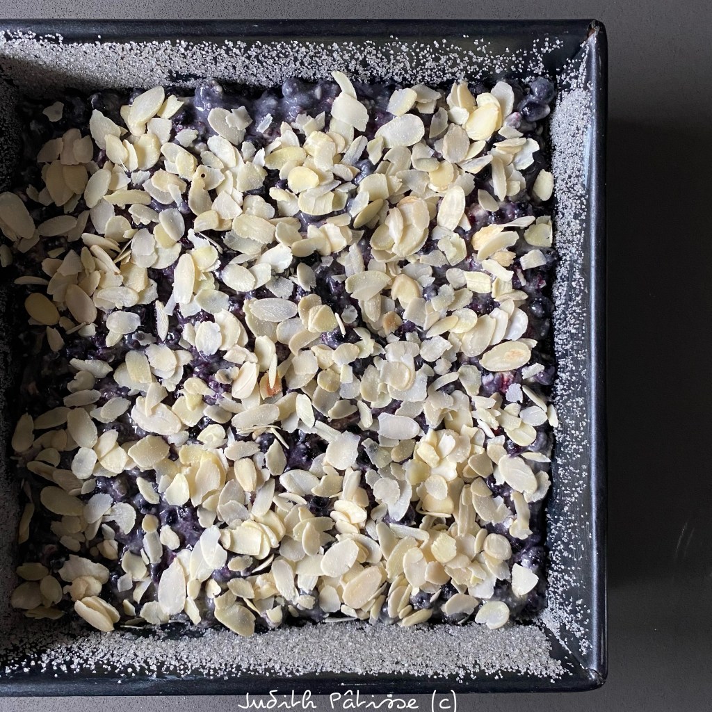 Débarrassez-la dans votre moule, répartissez-la bien sur toute la surface, parsemez d’amandes effilées si vous le souhaitez :