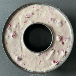 Bon, vous commencez à me connaître aussi depuis le temps ; j’ai forcément changé 2-3 petits trucs ! D’abord, dans le livre, il est indiqué de faire cuire le gâteau dans un moule à manquer traditionnel, mais franchement, avec les fruits surgelés (parce que oui, on utilise des framboises surgelées !), la pâte cuit mal au centre et le résultat n’est pas formidable – testé par votre aimable serviteur et pas approuvé. Par conséquent, je le fais cuire dans un moule à savarin, celui avec un trou au milieu, le même que j’utilise pour mon baba au rhum ou le cake au citron & lait ribot évoqué plus haut, et c’est juste p-a-r-f-a-i-t ! Il m’arrive aussi de le faire cuire dans un moule Nordicware que j’ai acheté récemment – toujours avec un trou au milieu, c’est la clé – et ça fait un cake juste t-r-o-p beau !