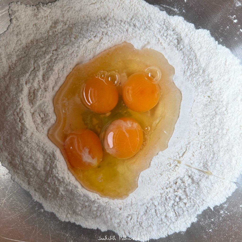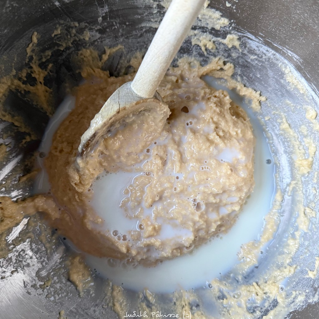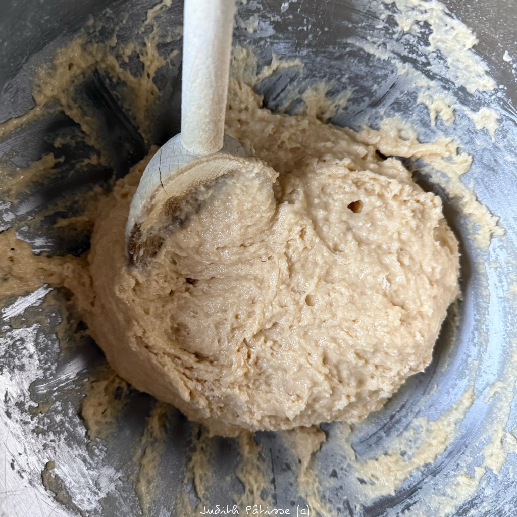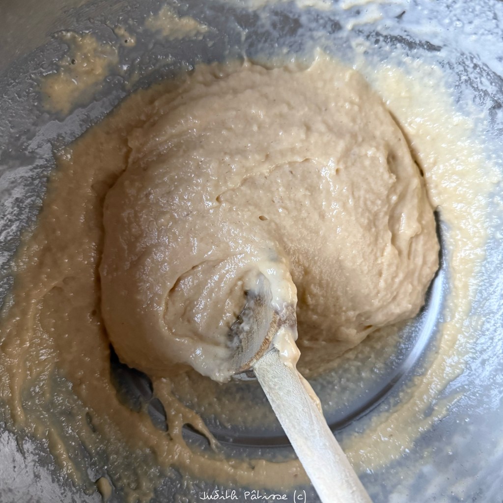 Battez d’abord seulement les oeufs puis intégrez petit à petit la farine qui se trouve sur les côtés. Faites ainsi jusqu’à ce qu’il n’y ait plus de trace de poudre. C’est du sport, mais tenez-bon ! Vous obtenez un pâton assez compact, comme sur la photo <-